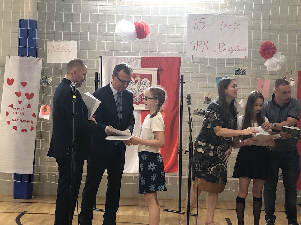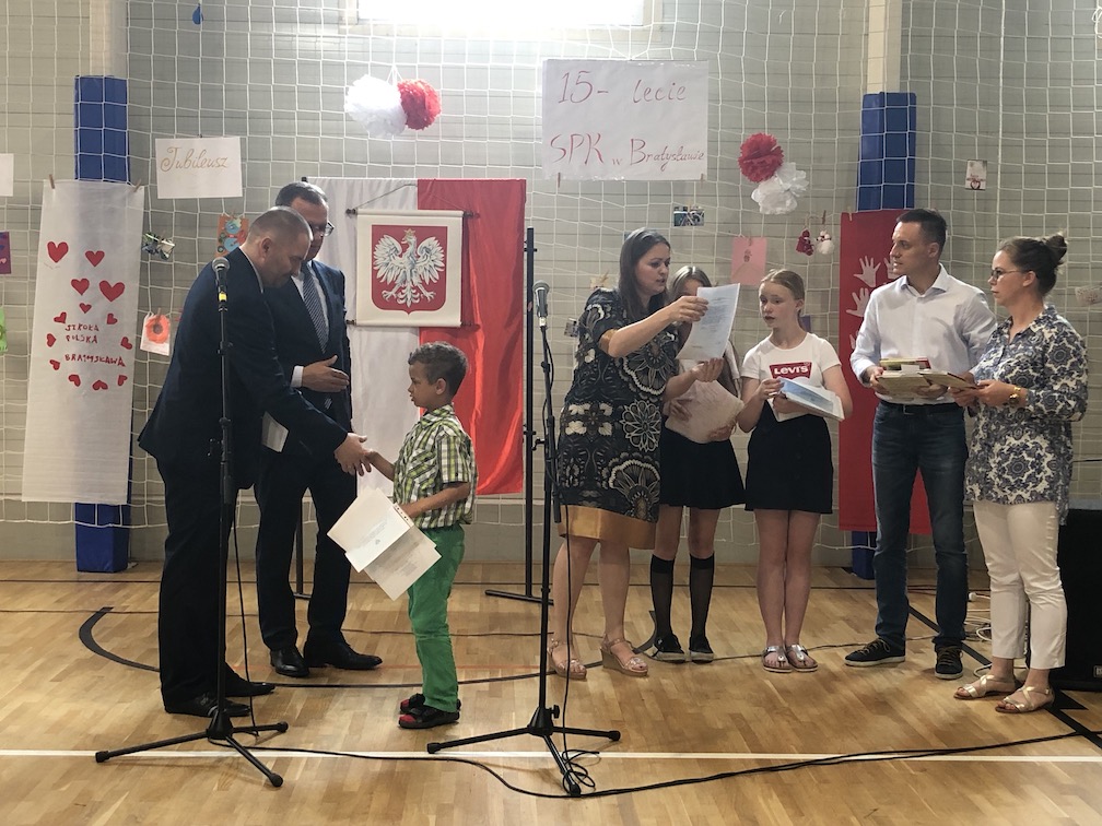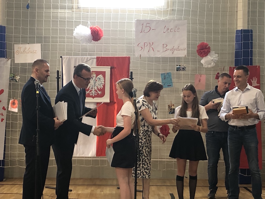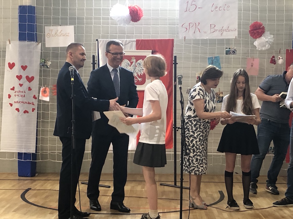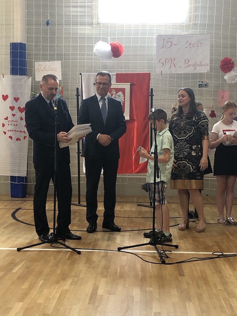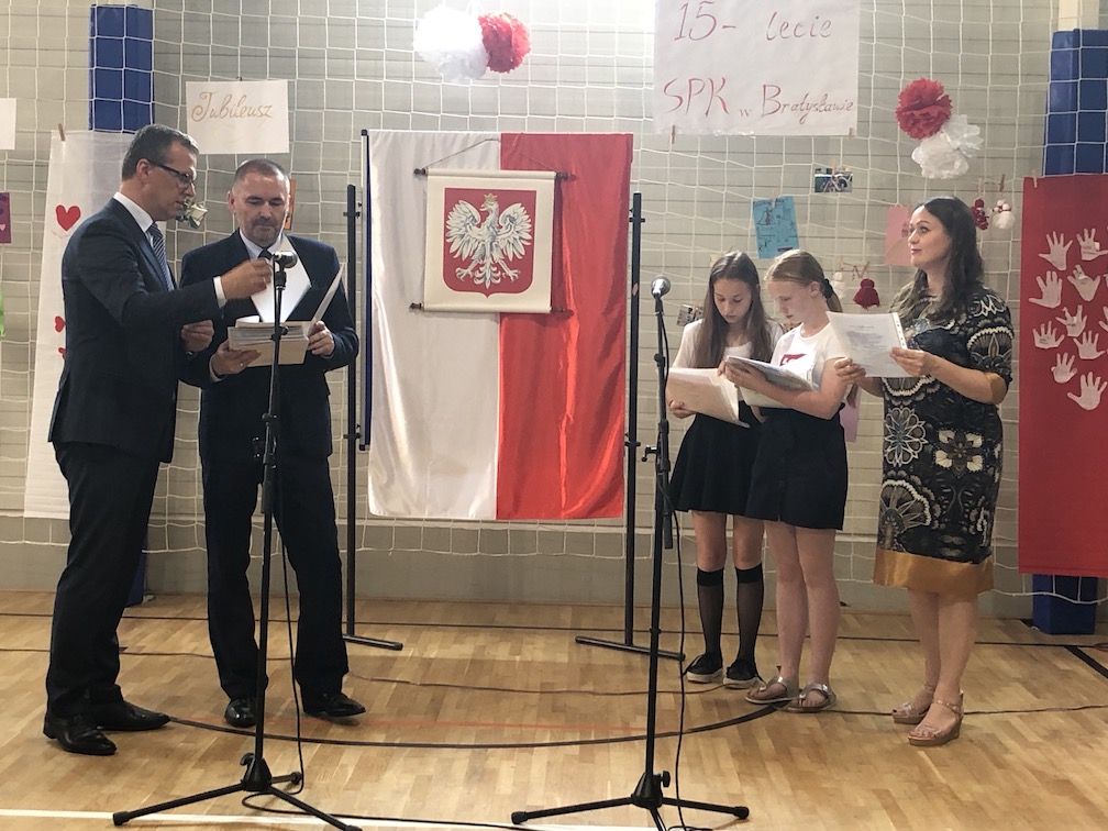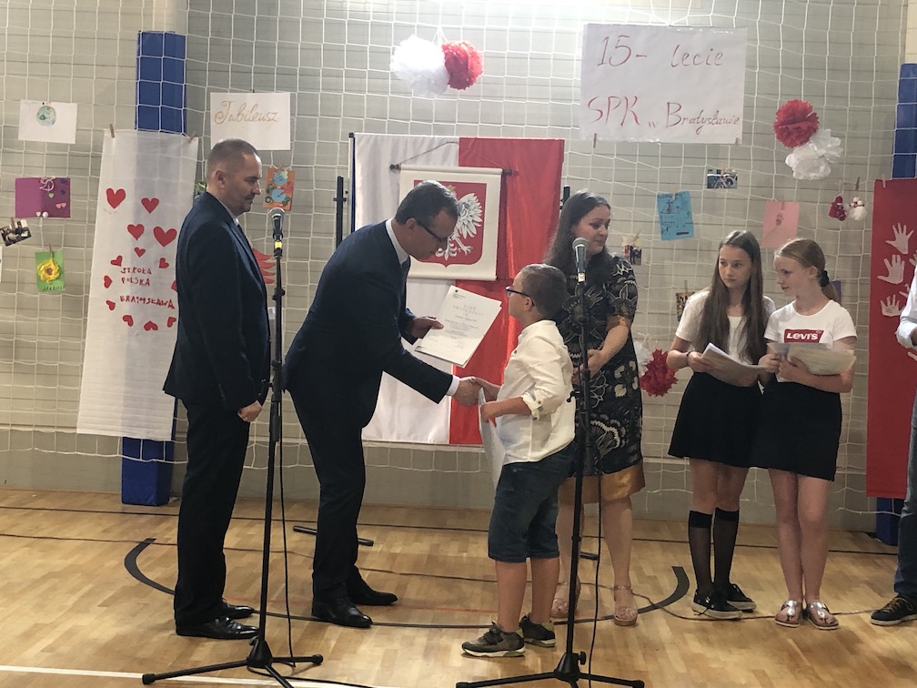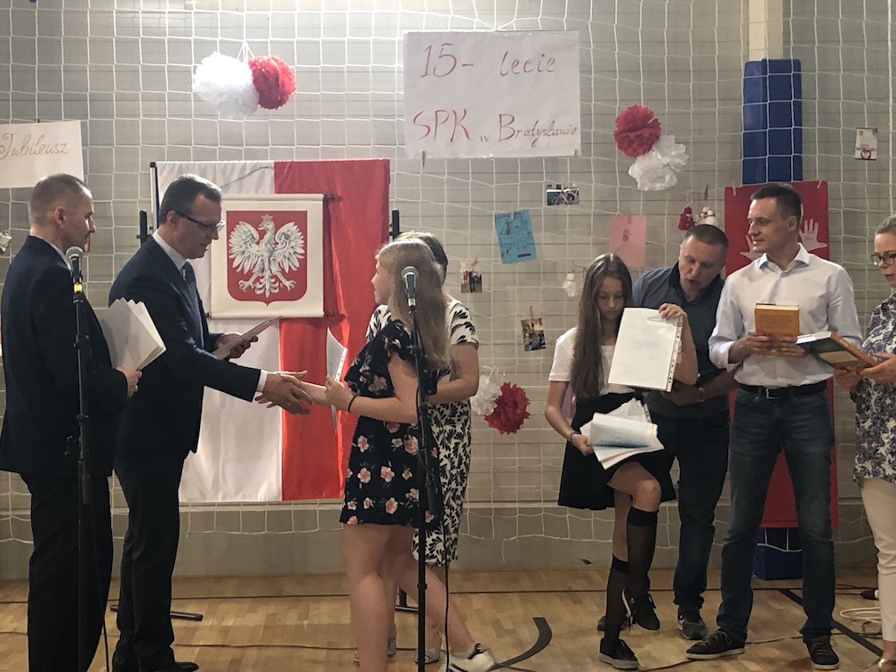 Parafrazując słowa znanej piosenki – 15 lat minęło jak jeden dzień i Szkolny Punkt Konsultacyjny przy Ambasadzie RP w Bratysławie doczekał się małego jubileuszu. 22 czerwca 2019 roku odbyły się uroczyste obchody 15-lecia naszej placówki. Na tak wielkim wydarzeniu nie mogło zabraknąć dostojnych gości. Swoją obecnością zaszczycili nas Ambasador RP na Słowacji Krzysztof Strzałka, Konsul RP na Słowacji Stanisław Kargul, wicedyrektorka Instytutu Polskiego w Bratysławie Monika Olech, przedstawiciele Polonii: prezes Klubu Polskiego Środkowe Poważe pan Zbigniew Podleśny oraz pan Marek Sobek i pani Ilona Wikieł, przedstawicielka zaprzyjaźnionej Szkoły Bułgarskiej im. Christa Boteva w Bratysławie Daniela Dojmová, przedstawiciel Wyższej Szkoły Pedagogicznej Pilgrim Schule w Wiedniu Michael Holzwieser oraz obecni i byli uczniowie wraz z rodzicami.