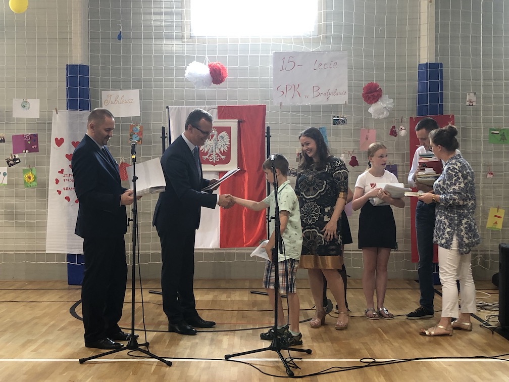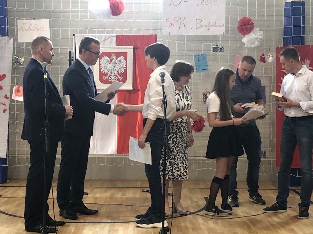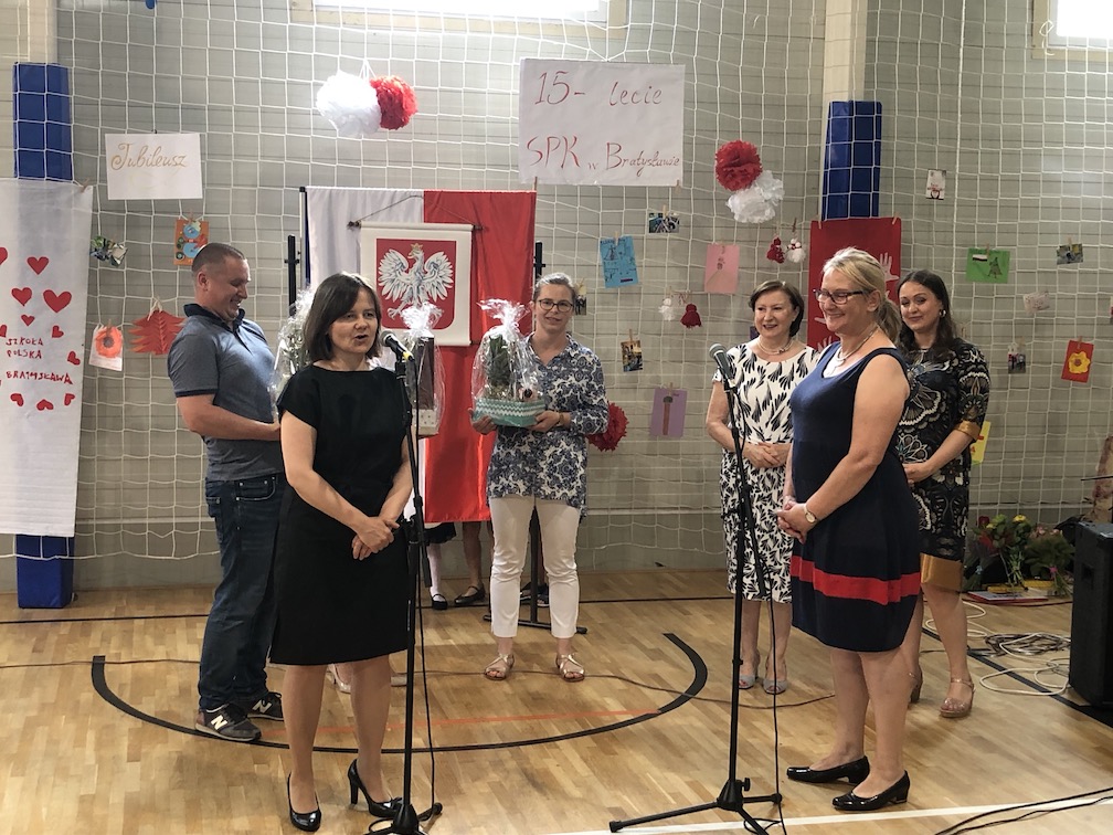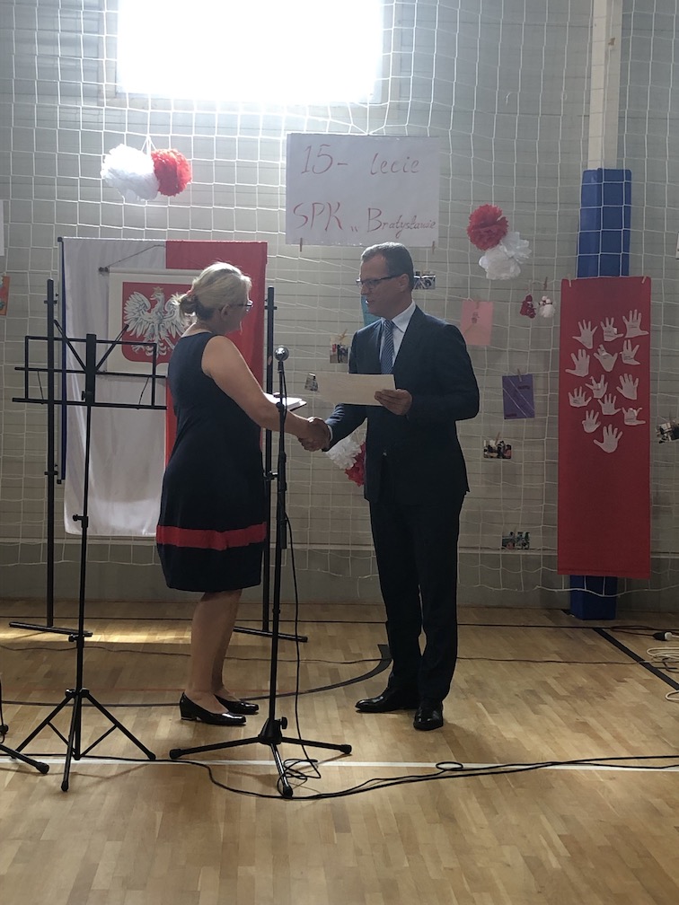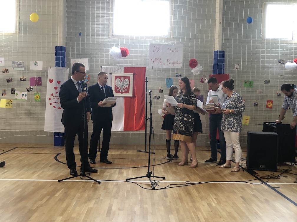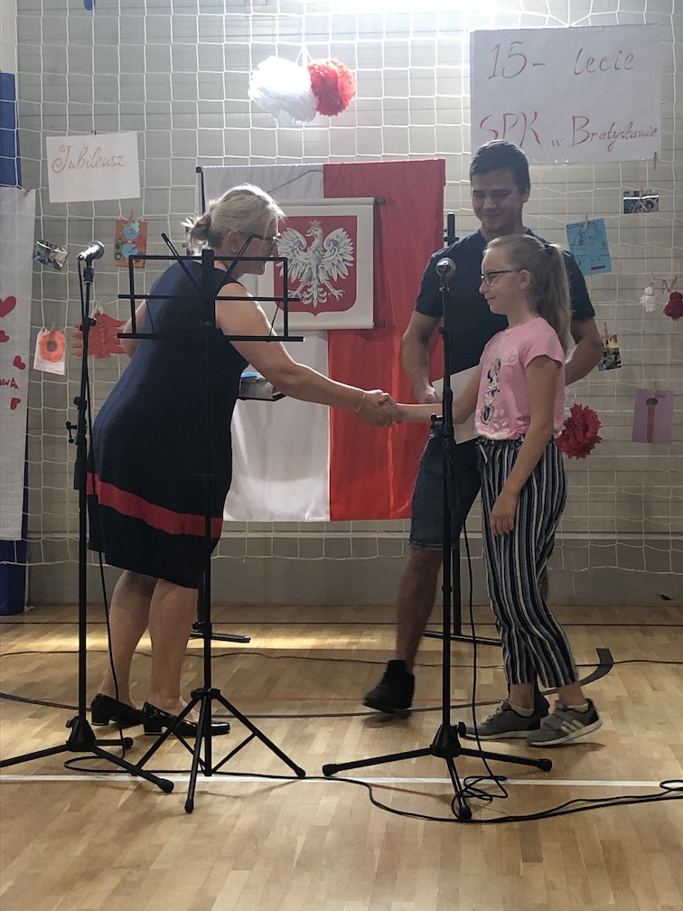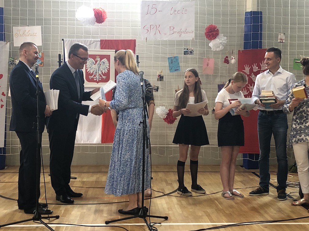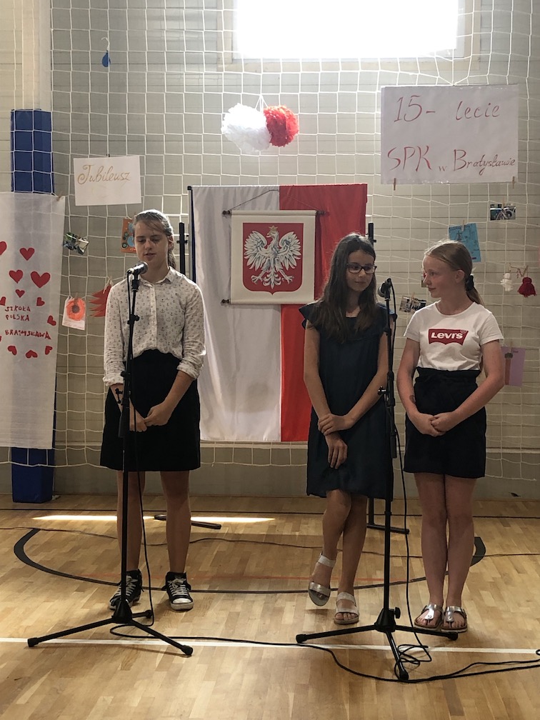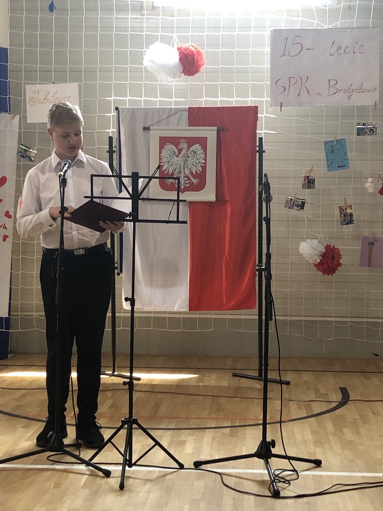 Parafrazując słowa znanej piosenki – 15 lat minęło jak jeden dzień i Szkolny Punkt Konsultacyjny przy Ambasadzie RP w Bratysławie doczekał się małego jubileuszu. 22 czerwca 2019 roku odbyły się uroczyste obchody 15-lecia naszej placówki. Na tak wielkim wydarzeniu nie mogło zabraknąć dostojnych gości. Swoją obecnością zaszczycili nas Ambasador RP na Słowacji Krzysztof Strzałka, Konsul RP na Słowacji Stanisław Kargul, wicedyrektorka Instytutu Polskiego w Bratysławie Monika Olech, przedstawiciele Polonii: prezes Klubu Polskiego Środkowe Poważe pan Zbigniew Podleśny oraz pan Marek Sobek i pani Ilona Wikieł, przedstawicielka zaprzyjaźnionej Szkoły Bułgarskiej im. Christa Boteva w Bratysławie Daniela Dojmová, przedstawiciel Wyższej Szkoły Pedagogicznej Pilgrim Schule w Wiedniu Michael Holzwieser oraz obecni i byli uczniowie wraz z rodzicami.