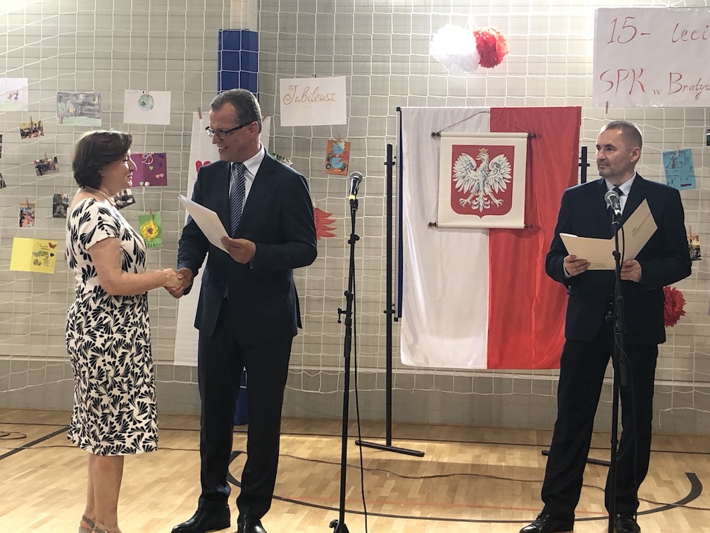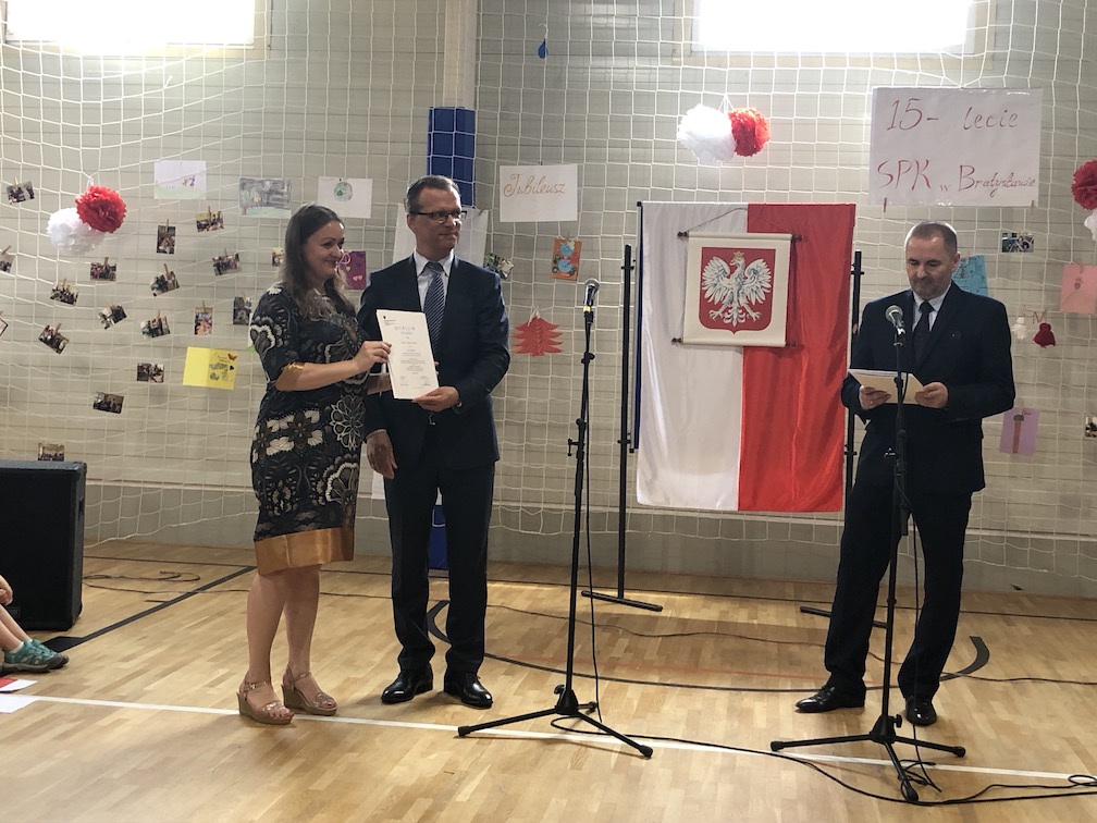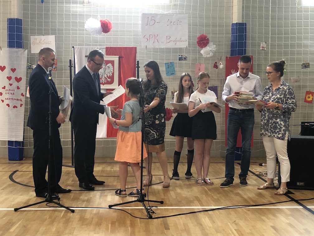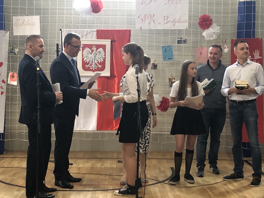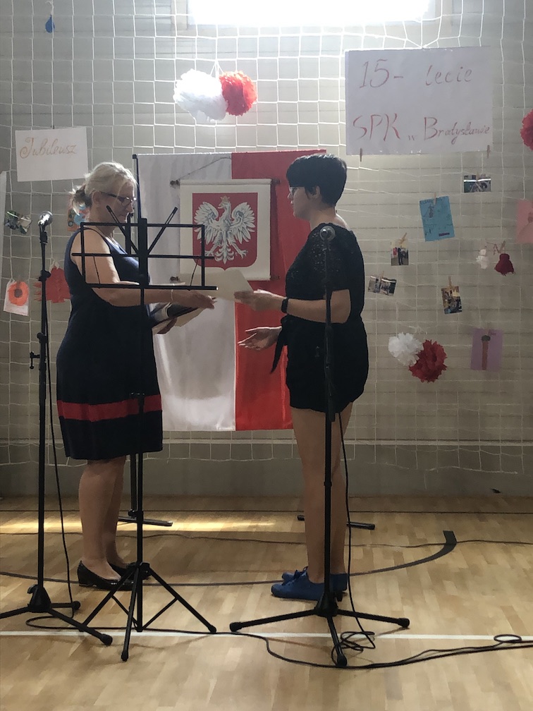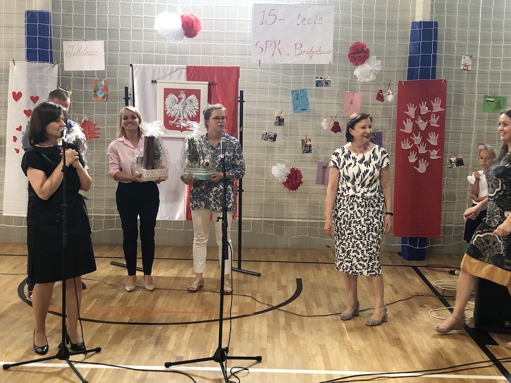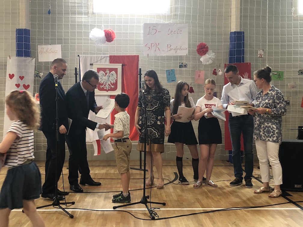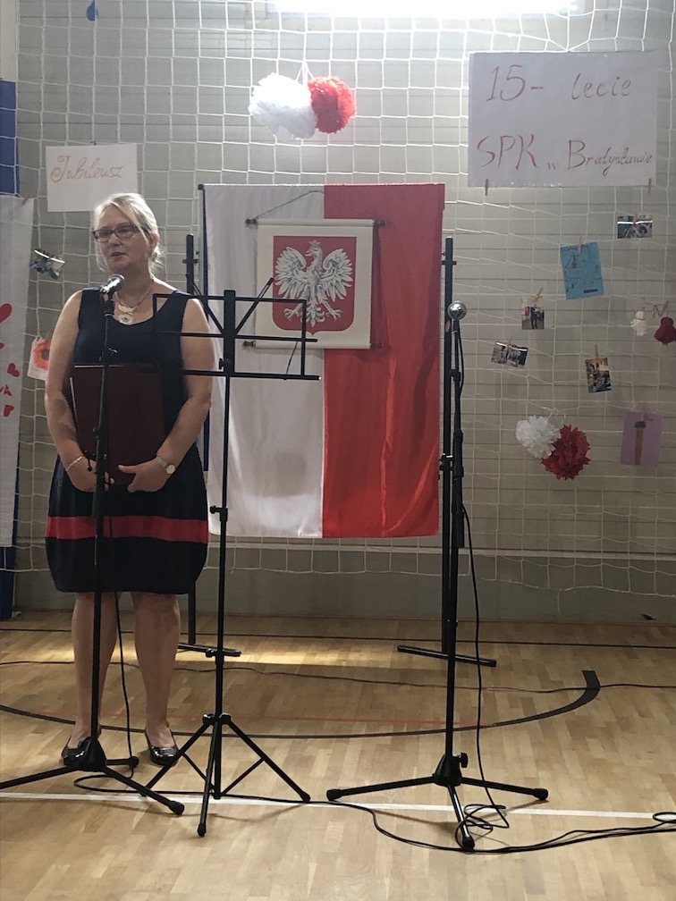 Parafrazując słowa znanej piosenki – 15 lat minęło jak jeden dzień i Szkolny Punkt Konsultacyjny przy Ambasadzie RP w Bratysławie doczekał się małego jubileuszu. 22 czerwca 2019 roku odbyły się uroczyste obchody 15-lecia naszej placówki. Na tak wielkim wydarzeniu nie mogło zabraknąć dostojnych gości. Swoją obecnością zaszczycili nas Ambasador RP na Słowacji Krzysztof Strzałka, Konsul RP na Słowacji Stanisław Kargul, wicedyrektorka Instytutu Polskiego w Bratysławie Monika Olech, przedstawiciele Polonii: prezes Klubu Polskiego Środkowe Poważe pan Zbigniew Podleśny oraz pan Marek Sobek i pani Ilona Wikieł, przedstawicielka zaprzyjaźnionej Szkoły Bułgarskiej im. Christa Boteva w Bratysławie Daniela Dojmová, przedstawiciel Wyższej Szkoły Pedagogicznej Pilgrim Schule w Wiedniu Michael Holzwieser oraz obecni i byli uczniowie wraz z rodzicami.