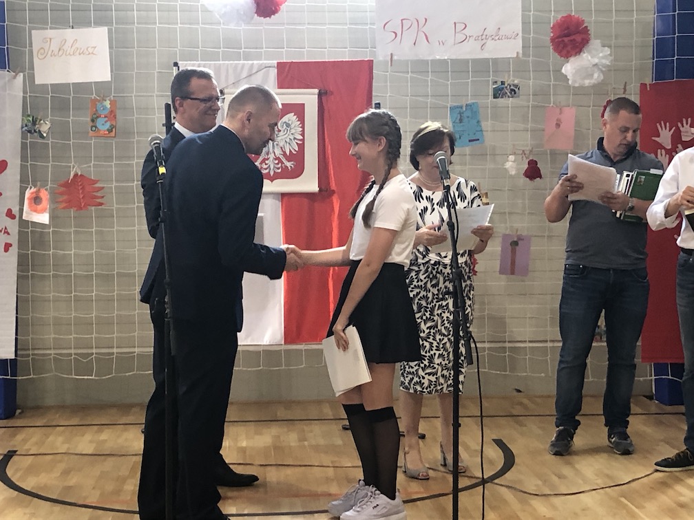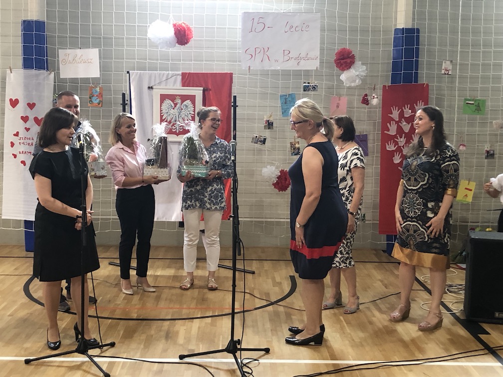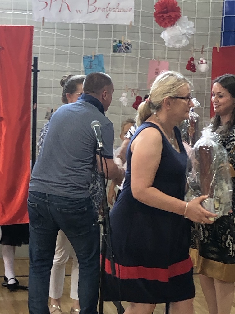 Jak przystało na jubilata, nasza szkoła przyjmowała tego dnia liczne życzenia, m. in. od nieobecnych na uroczystości, znakomitych pracowników i przyjaciół szkoły z panią dr Ireną Bilińską, założycielką i pierwszą kierowniczką SPK w Bratysławie na czele. Nie zabrakło też przepięknych kwiatów, w tym wspaniałego bukietu róż od przewodniczącej Klubu Polonus pani Katarzyny Bielik.