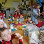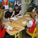 Zajęcia plastyczne nie były jednak jedyną atrakcją. Po uroczystym otwarciu warsztatów przez panią dyrektor swoje 5 minut mieli nasi wspaniali pierwszoklasiści, którzy przygotowali na ten dzień specjalną pastorałkę. O to, by świąteczny nastrój nikogo nie opuścił nawet na chwilę, zatroszczyli się również rodzice uczniów, przygotowując przepyszny poczęstunek, a pracę nad dekoracjami dodatkowo umilało nam wspólne kolędowanie przy akompaniamencie pana Łukasza Cupała.