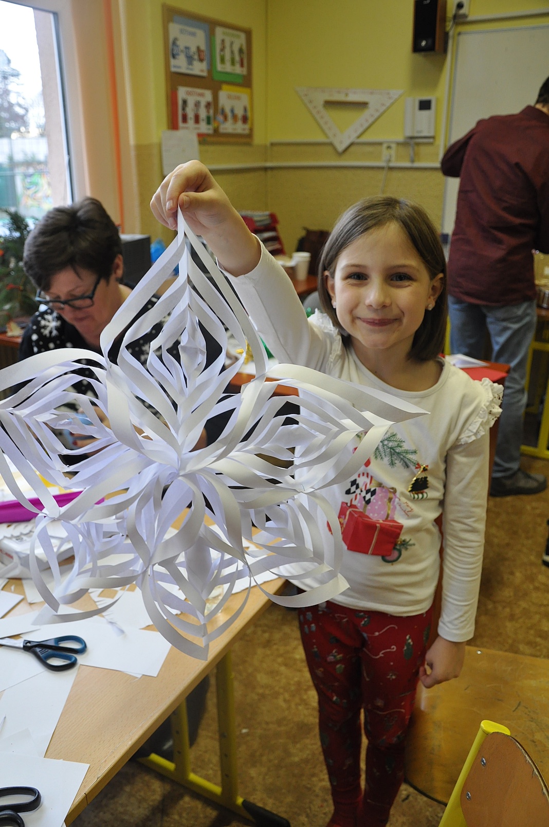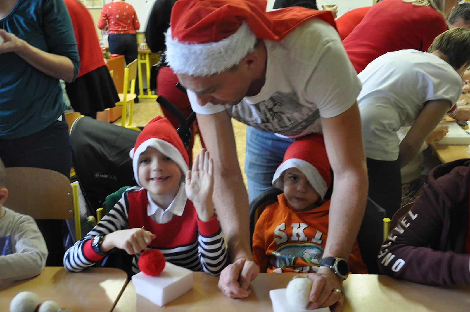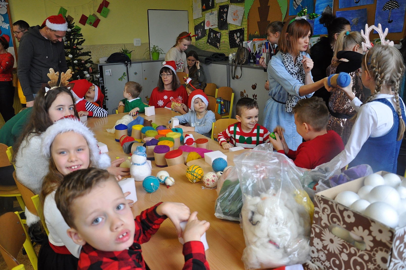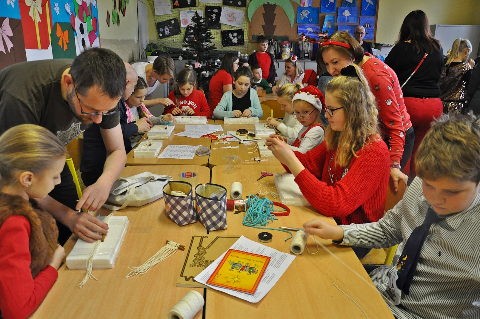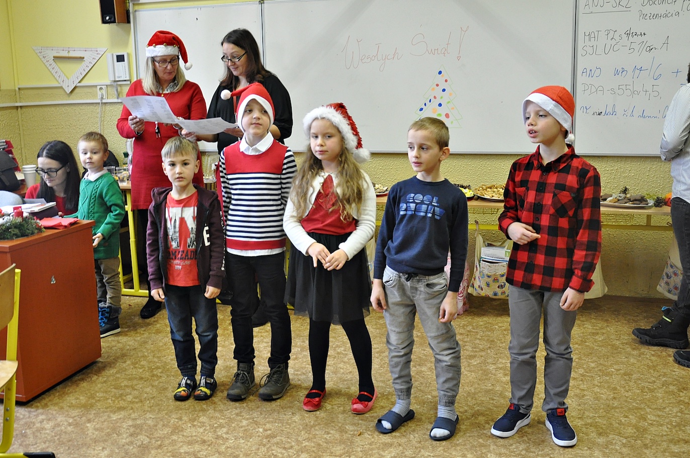 Zajęcia plastyczne nie były jednak jedyną atrakcją. Po uroczystym otwarciu warsztatów przez panią dyrektor swoje 5 minut mieli nasi wspaniali pierwszoklasiści, którzy przygotowali na ten dzień specjalną pastorałkę. O to, by świąteczny nastrój nikogo nie opuścił nawet na chwilę, zatroszczyli się również rodzice uczniów, przygotowując przepyszny poczęstunek, a pracę nad dekoracjami dodatkowo umilało nam wspólne kolędowanie przy akompaniamencie pana Łukasza Cupała.