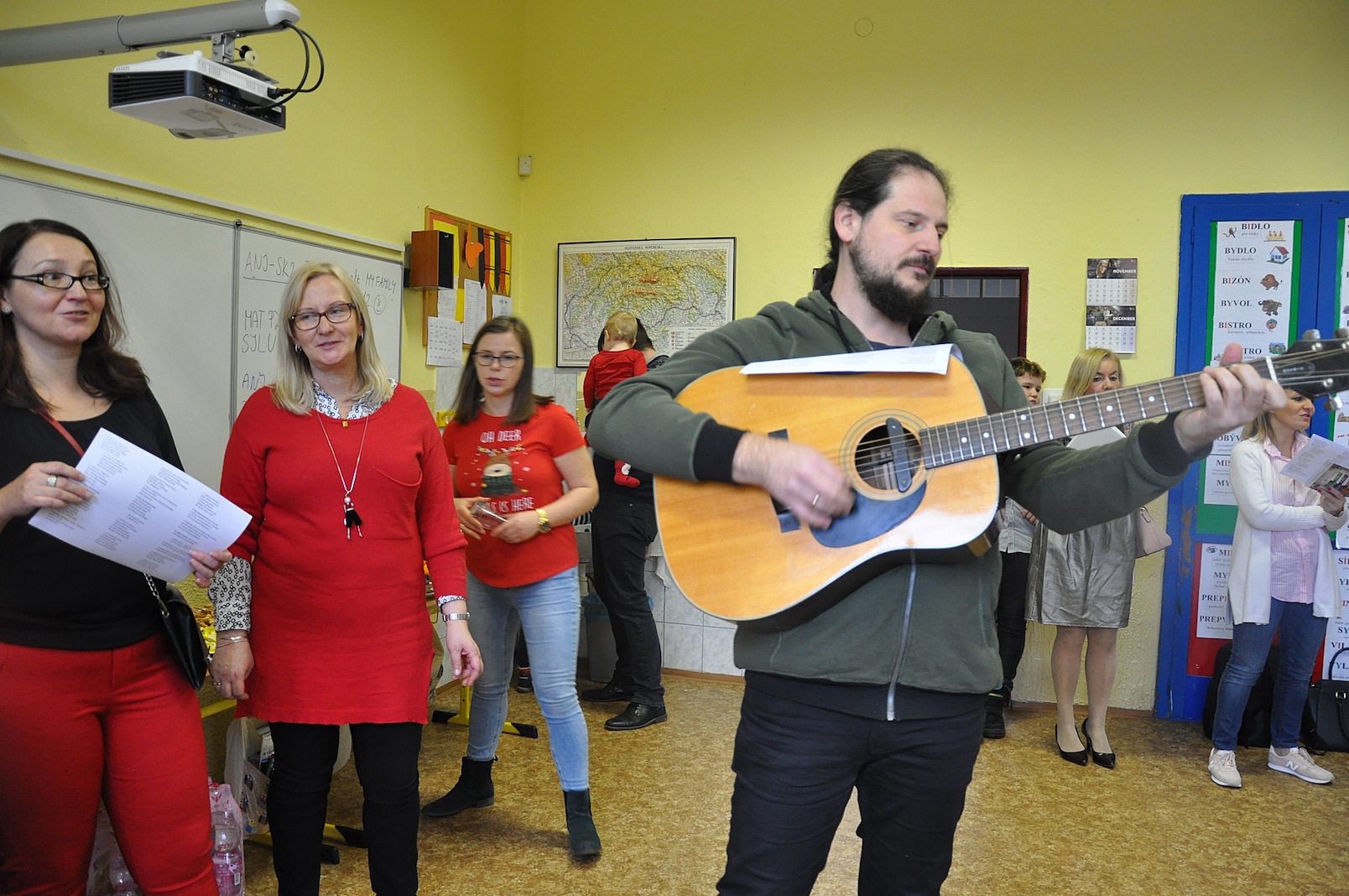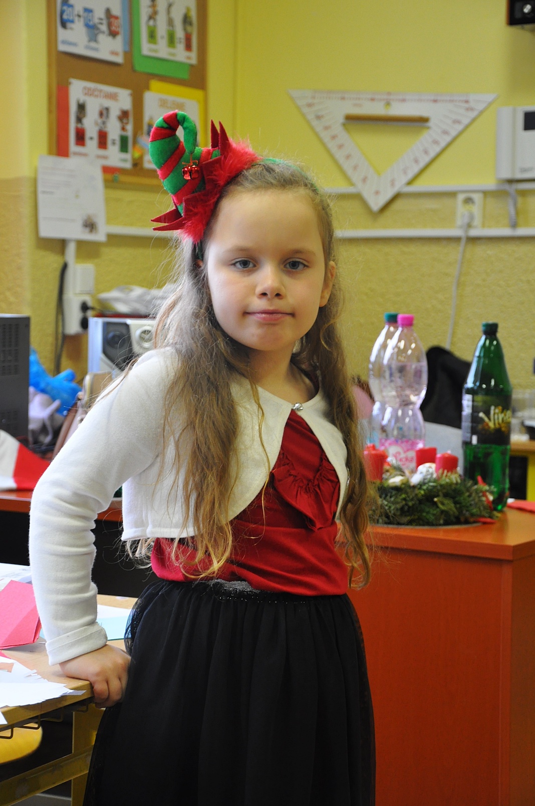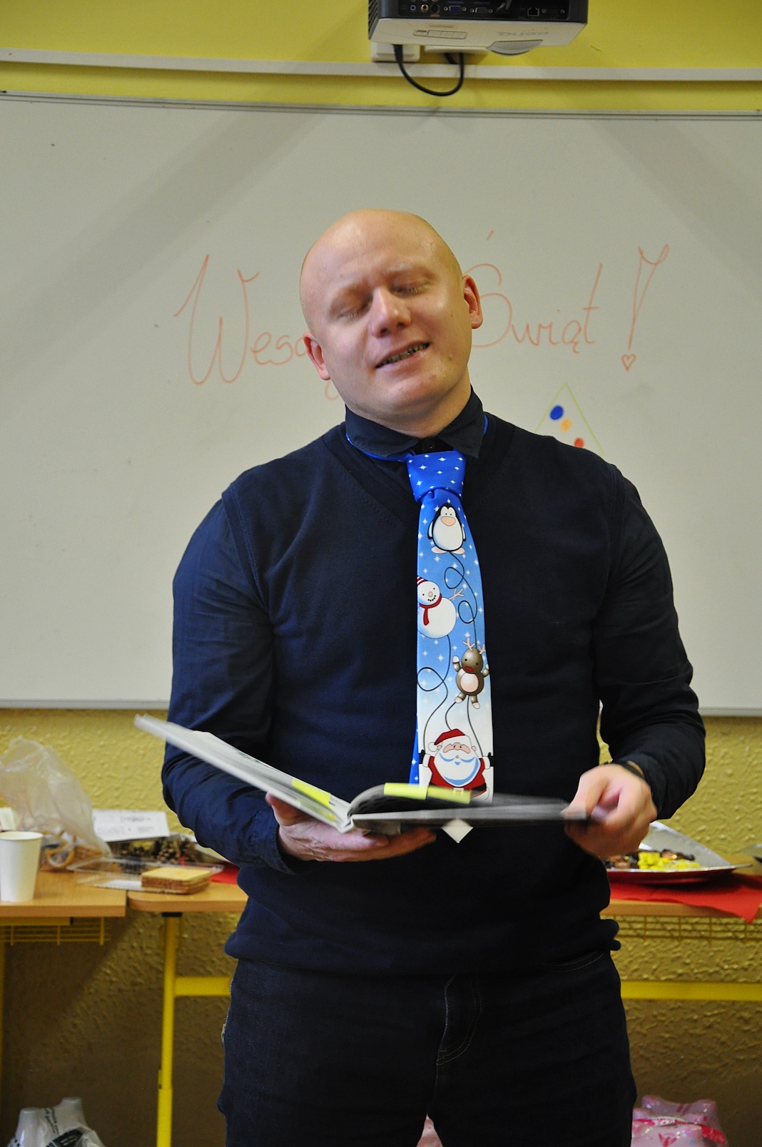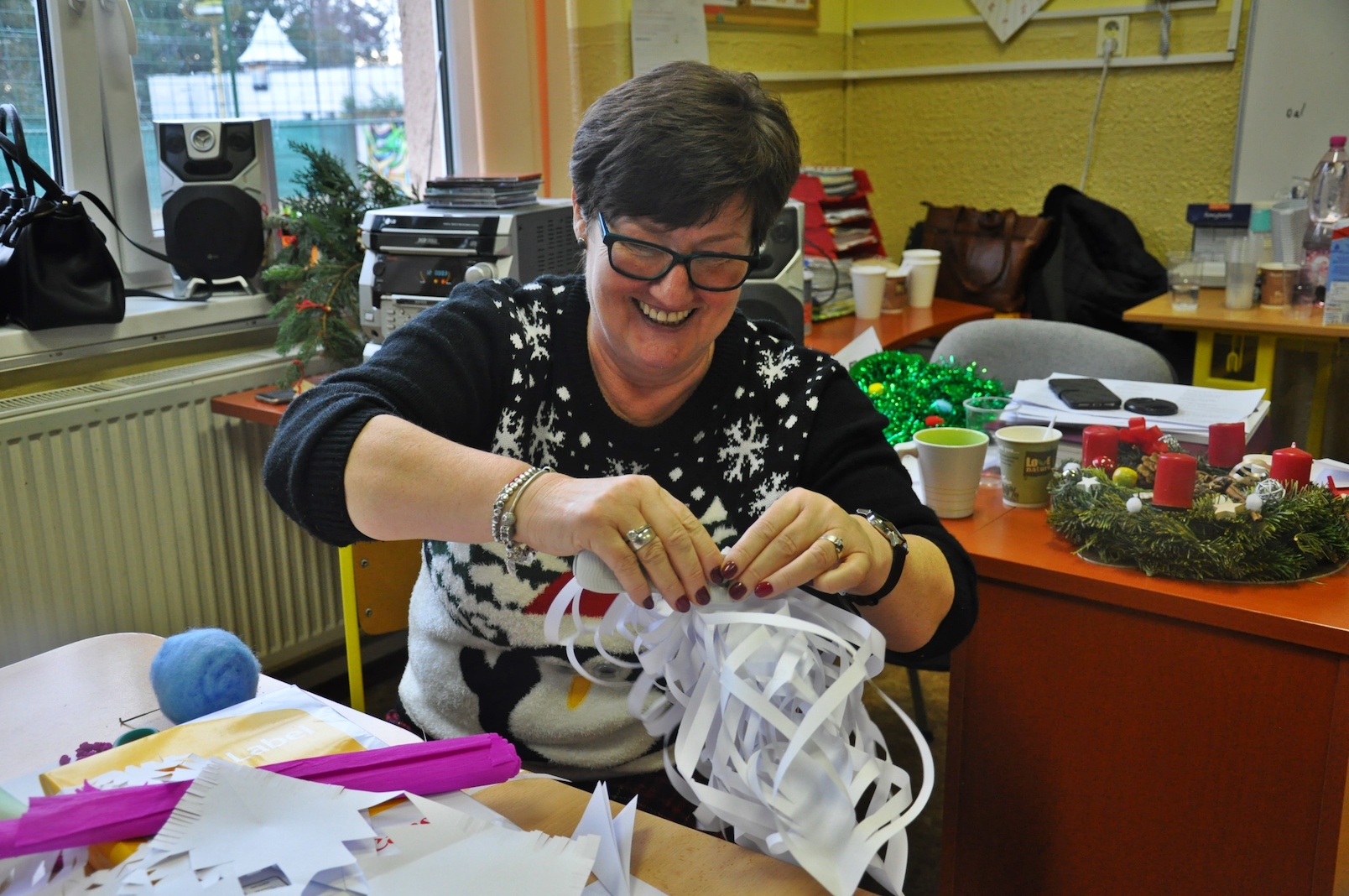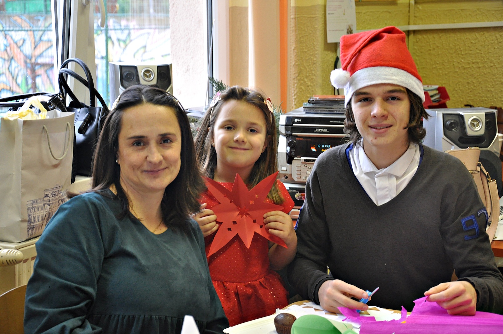 Zajęcia plastyczne nie były jednak jedyną atrakcją. Po uroczystym otwarciu warsztatów przez panią dyrektor swoje 5 minut mieli nasi wspaniali pierwszoklasiści, którzy przygotowali na ten dzień specjalną pastorałkę. O to, by świąteczny nastrój nikogo nie opuścił nawet na chwilę, zatroszczyli się również rodzice uczniów, przygotowując przepyszny poczęstunek, a pracę nad dekoracjami dodatkowo umilało nam wspólne kolędowanie przy akompaniamencie pana Łukasza Cupała.