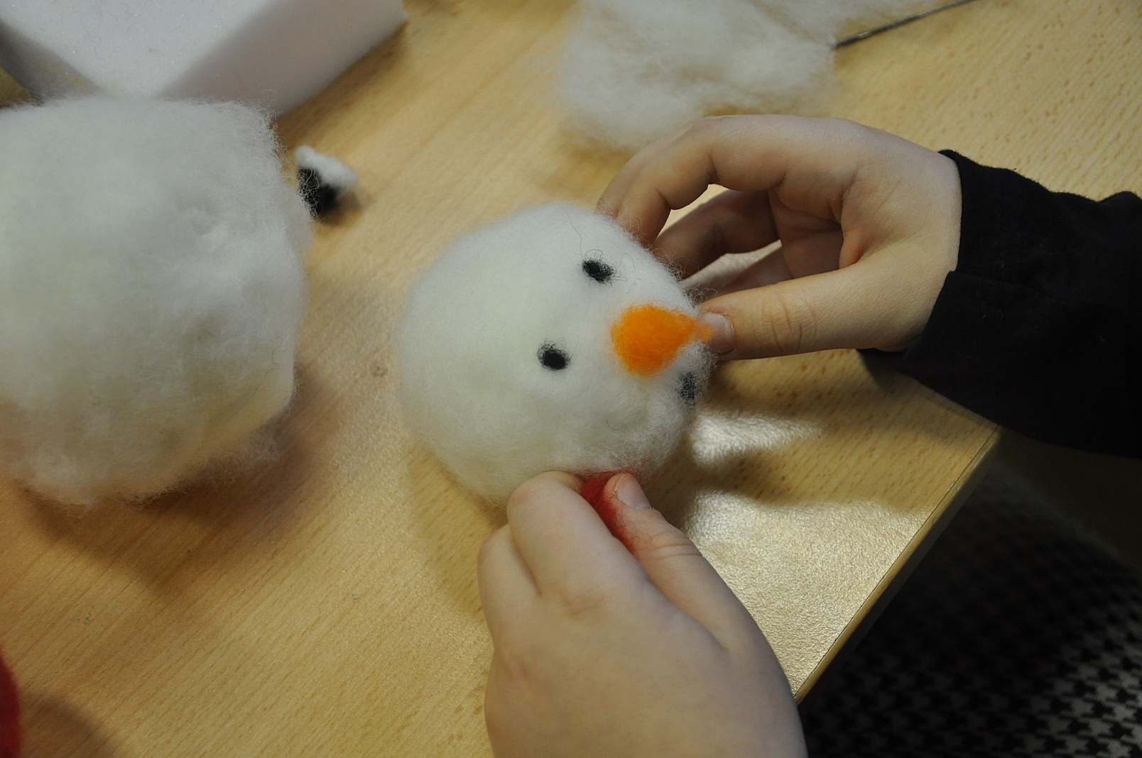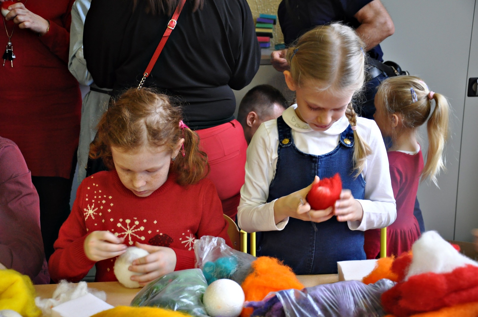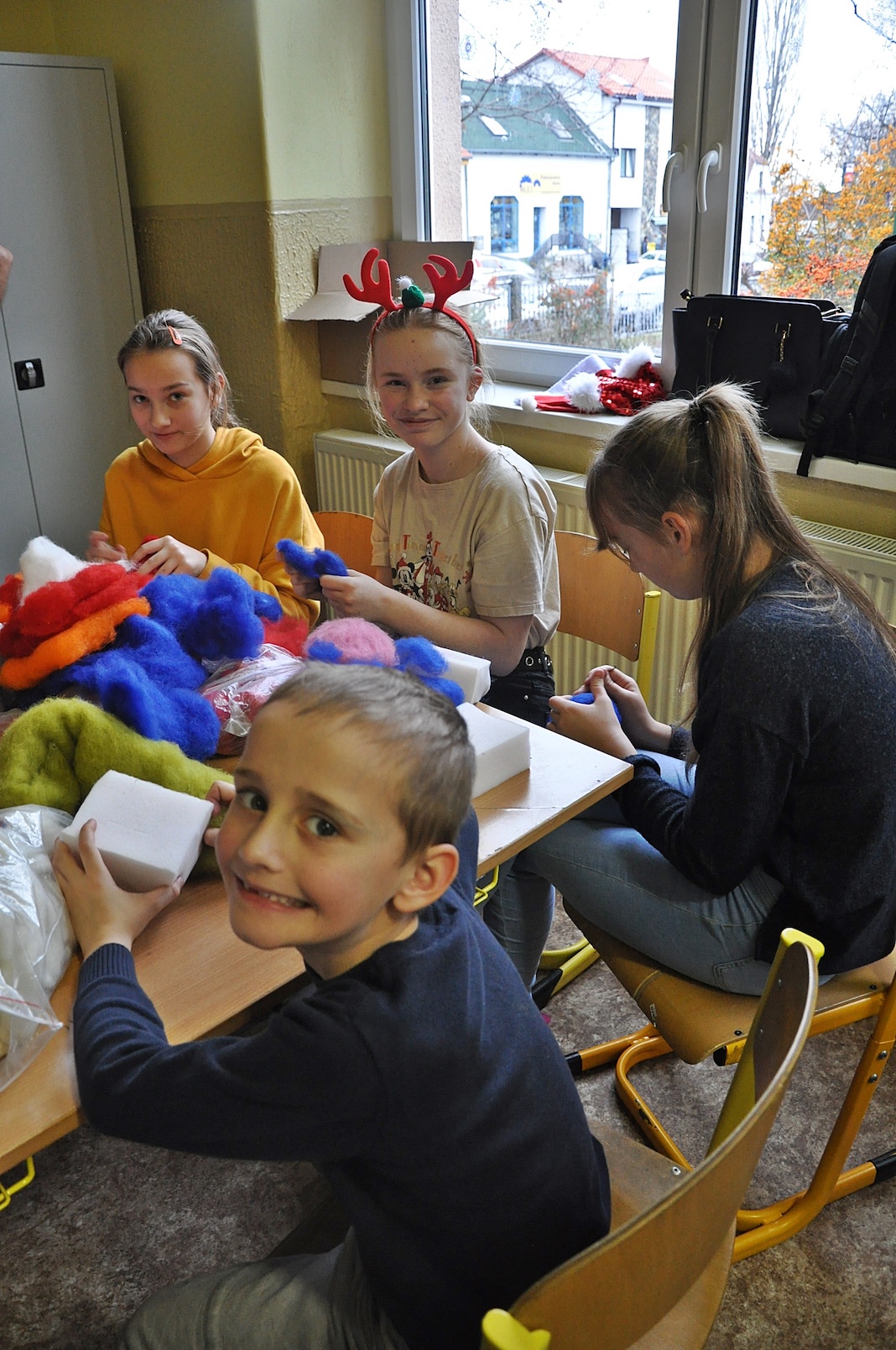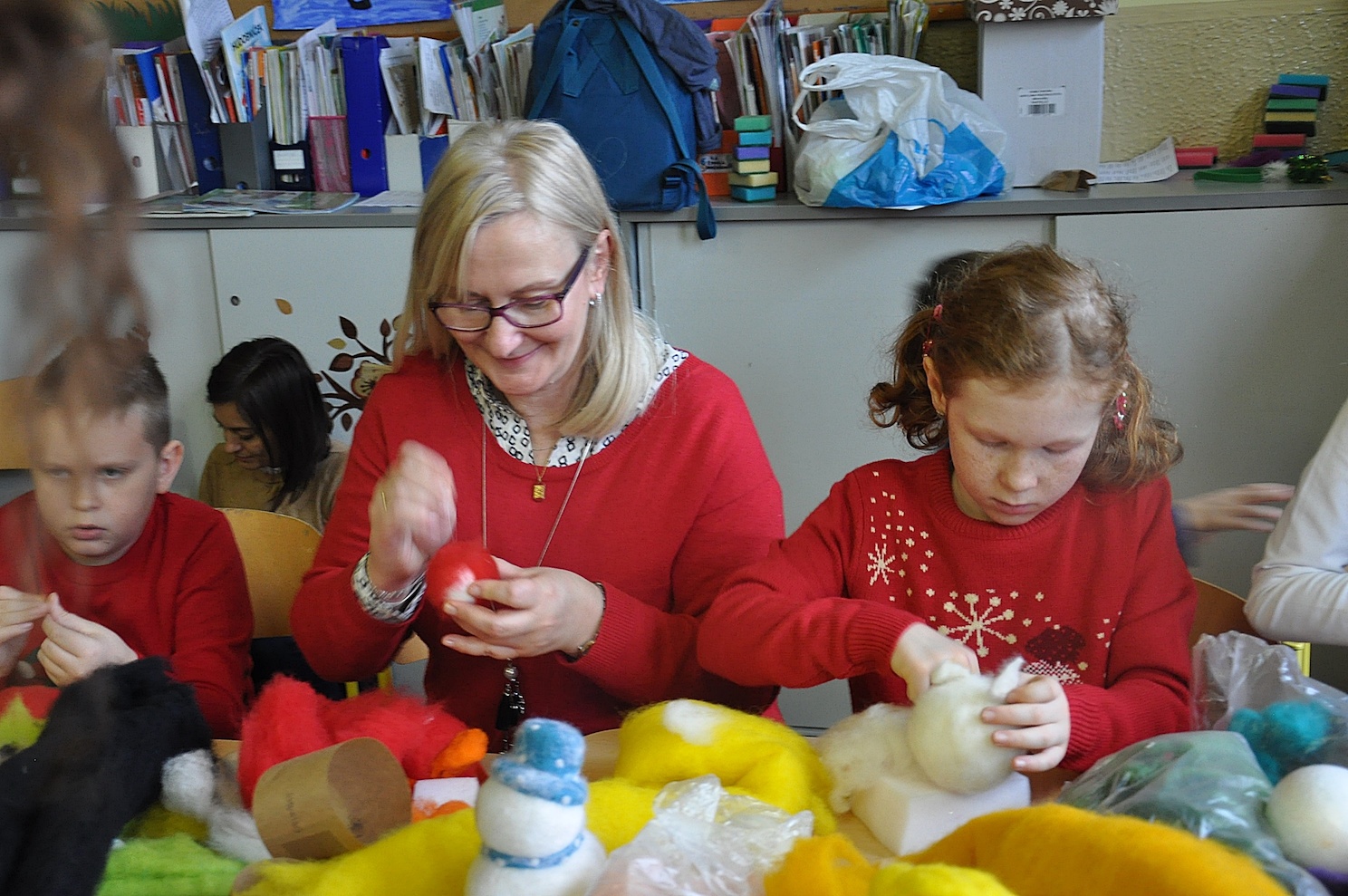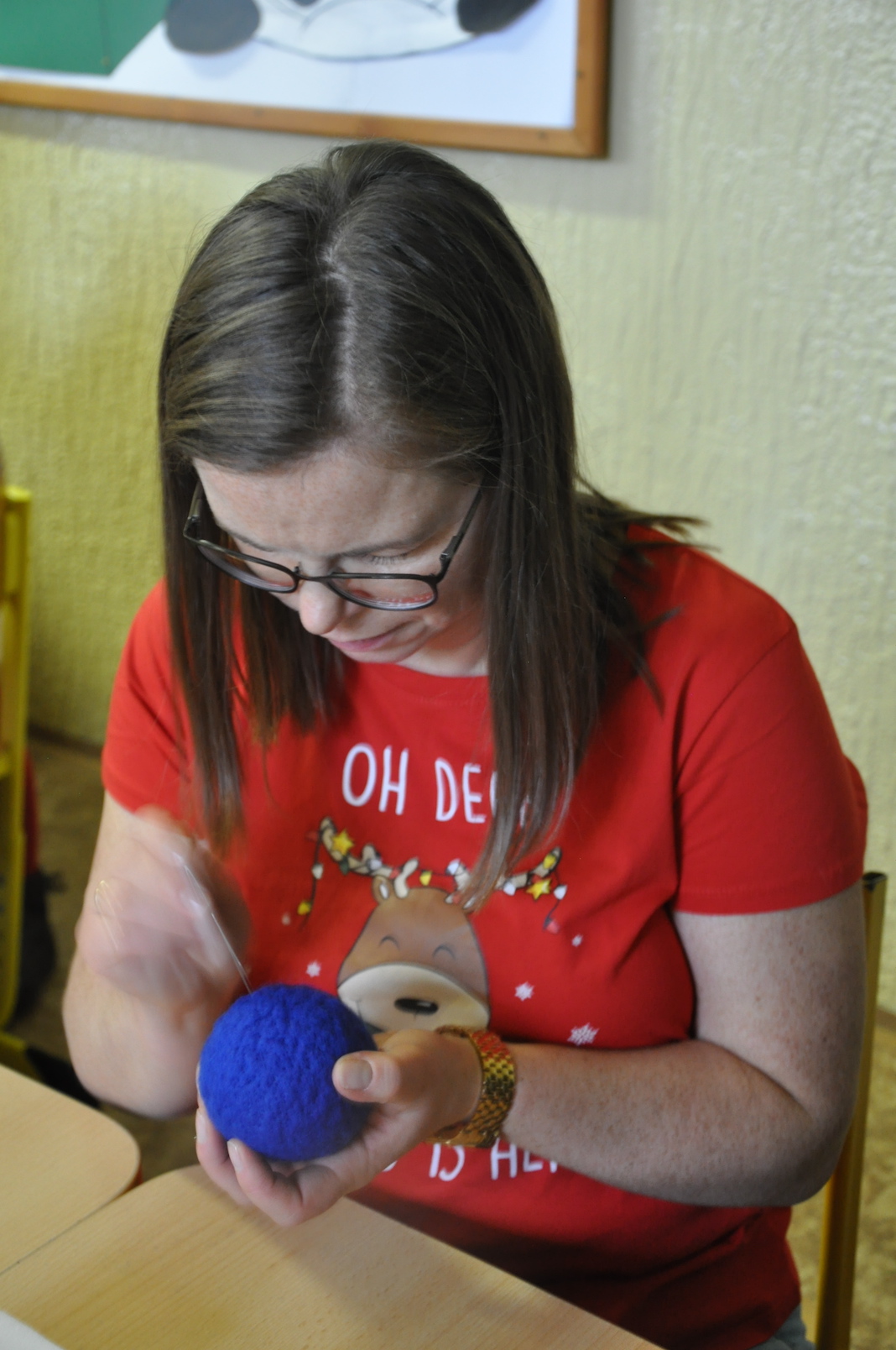 Głównym punktem programu były zajęcia plastyczne prowadzone przez trzy wspaniałe artystki: Agnieszkę Chrzanowską-Małys, Ewę Pliszczyńską i Urszulę Przybylską. Pani Agnieszka, kierująca na co dzień autorską pracownią artystyczną Studio ACM w Gliwicach, uczyła obecnych, na czym polega filcowanie na sucho i co można wyczarować dzięki tej technice na bombkach choinkowych. Gdy rozdano materiały do pracy, igły poszły w ruch, a uczestnicy warsztatów pracowali w takim skupieniu, że słychać było tylko szelest przebijanych kul.