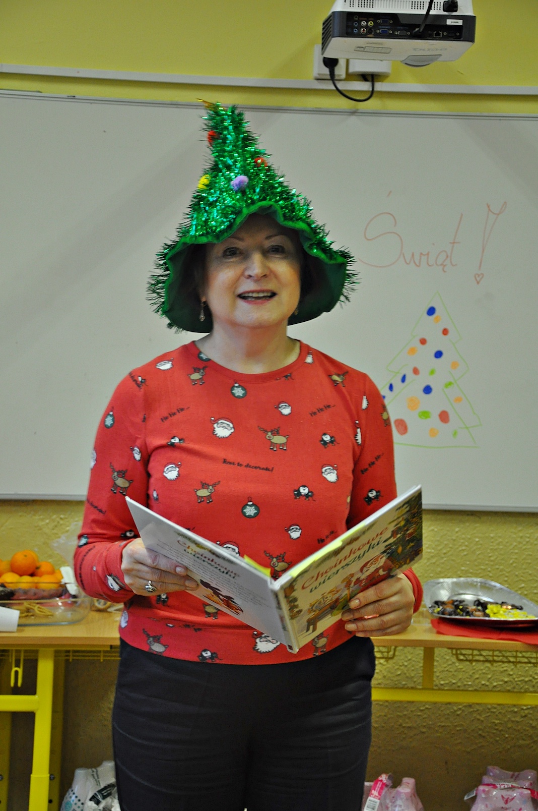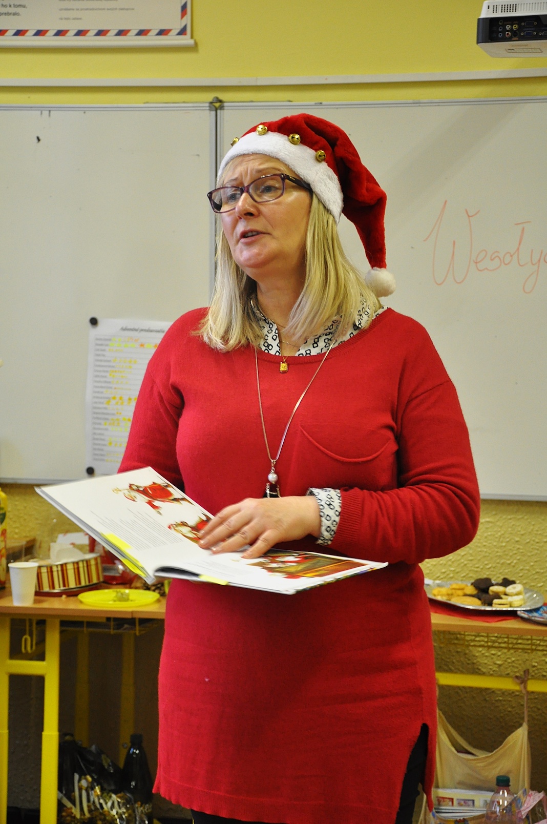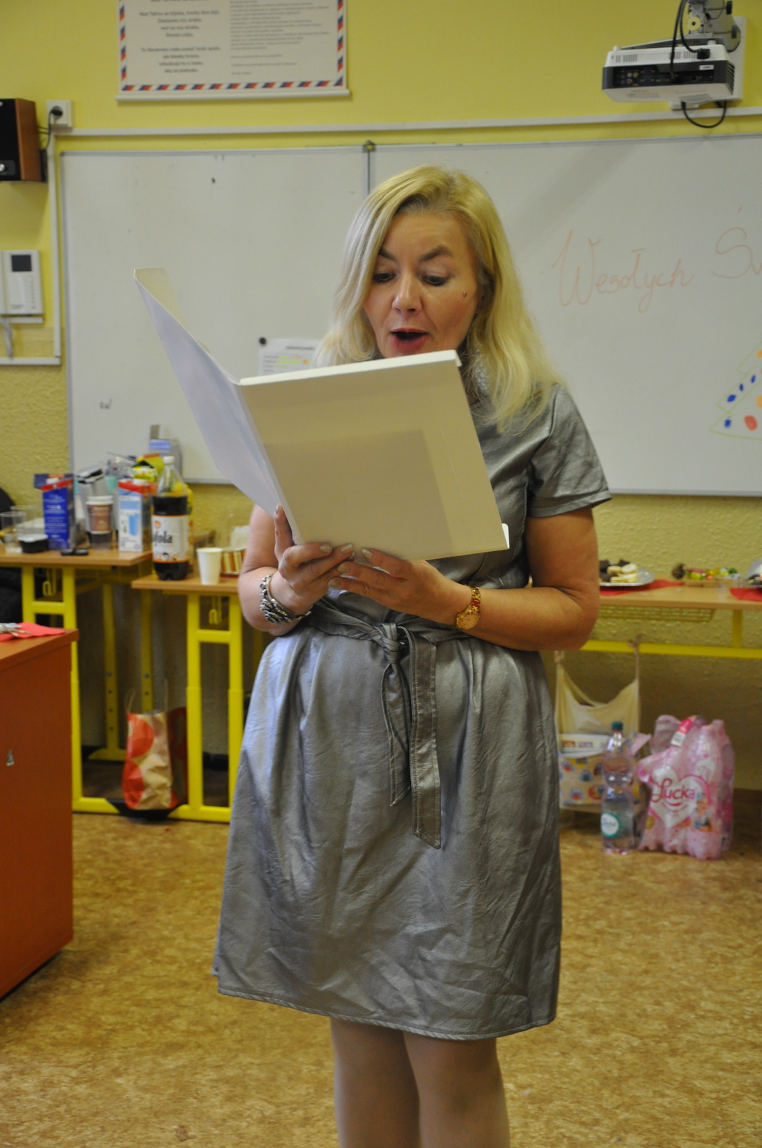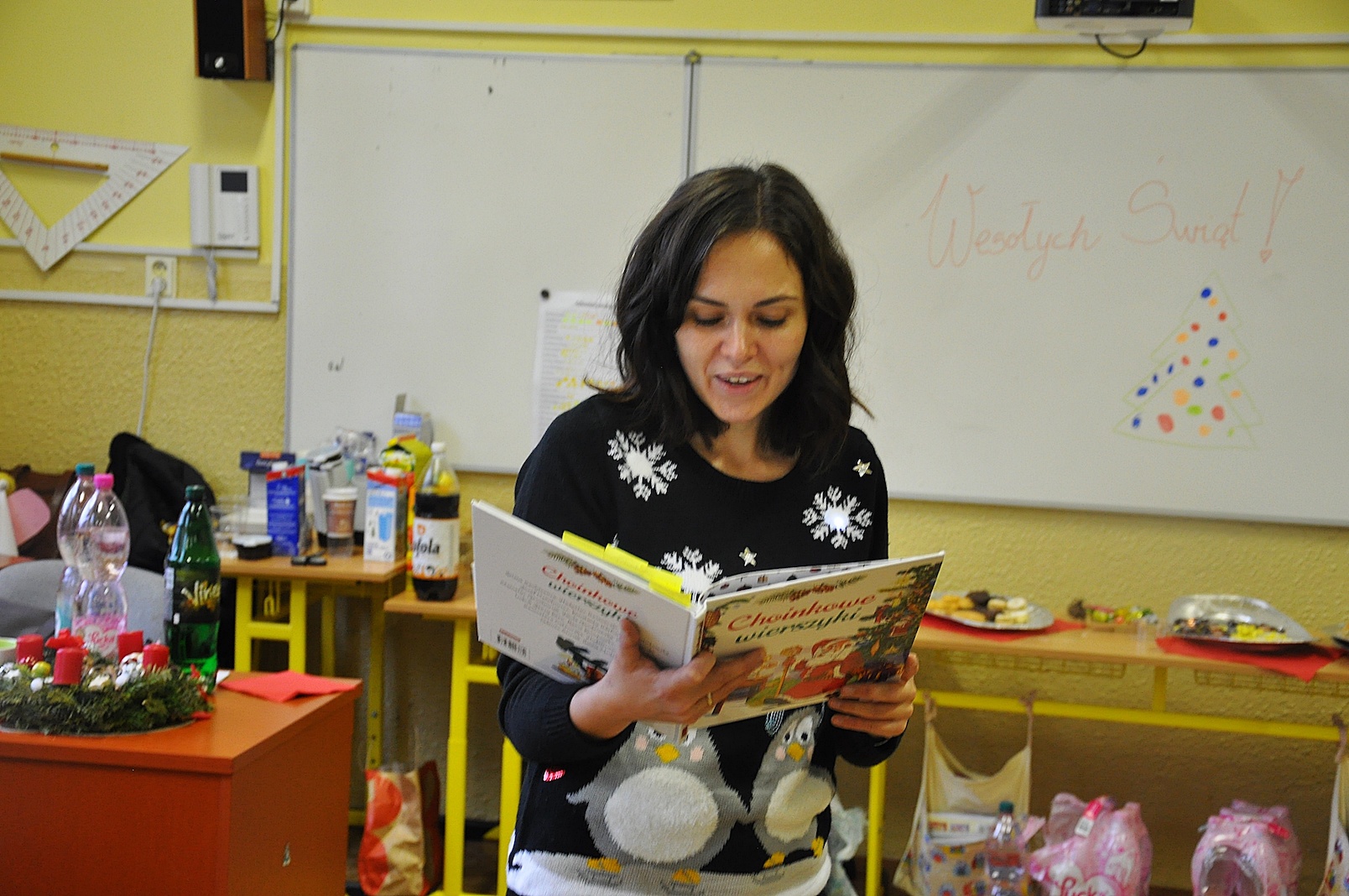 Wisienką na torcie i zamknięciem całych warsztatów był malutki prezent dla wszystkich obecnych, który przyszykowało grono pedagogiczne. Tym razem to nauczyciele, a nie – jak zazwyczaj – uczniowie, przygotowali krótki program sceniczny i zaprezentowali przepiękne polskie wiersze o tematyce świątecznej. I tak pani dyrektor Monika Holzwieser zamieniła się na chwilę w św. Mikołaja, pani Ania Kasperska wspaniale przystrojona zadeklamowała wiersz o choince, pani Marzanna Danek-Hnelozub opowiedziała legendę o tym zielonym drzewku, ksiądz Krystian Piotrowski rozbawił wszystkich, zapraszając do wspólnej recytacji i wymieniania różnych kolorów śniegu, a pani Natalia Konicz-Hamada wprawiła w nostalgiczny nastrój, przypominając obraz polskiego wieczoru wigilijnego. Magia Bożego Narodzenia była wszechobecna.