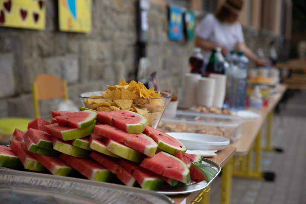 O strefę żywieniową zadbali rodzice naszych uczniów. Dla dzieci były owoce, słodkie i słone przekąski oraz zimne napoje, dla starszych kawa. Na obiad przygotowano gulasz i zamówiono pizzę, którą wszyscy zajadali się ze smakiem.