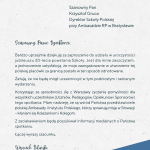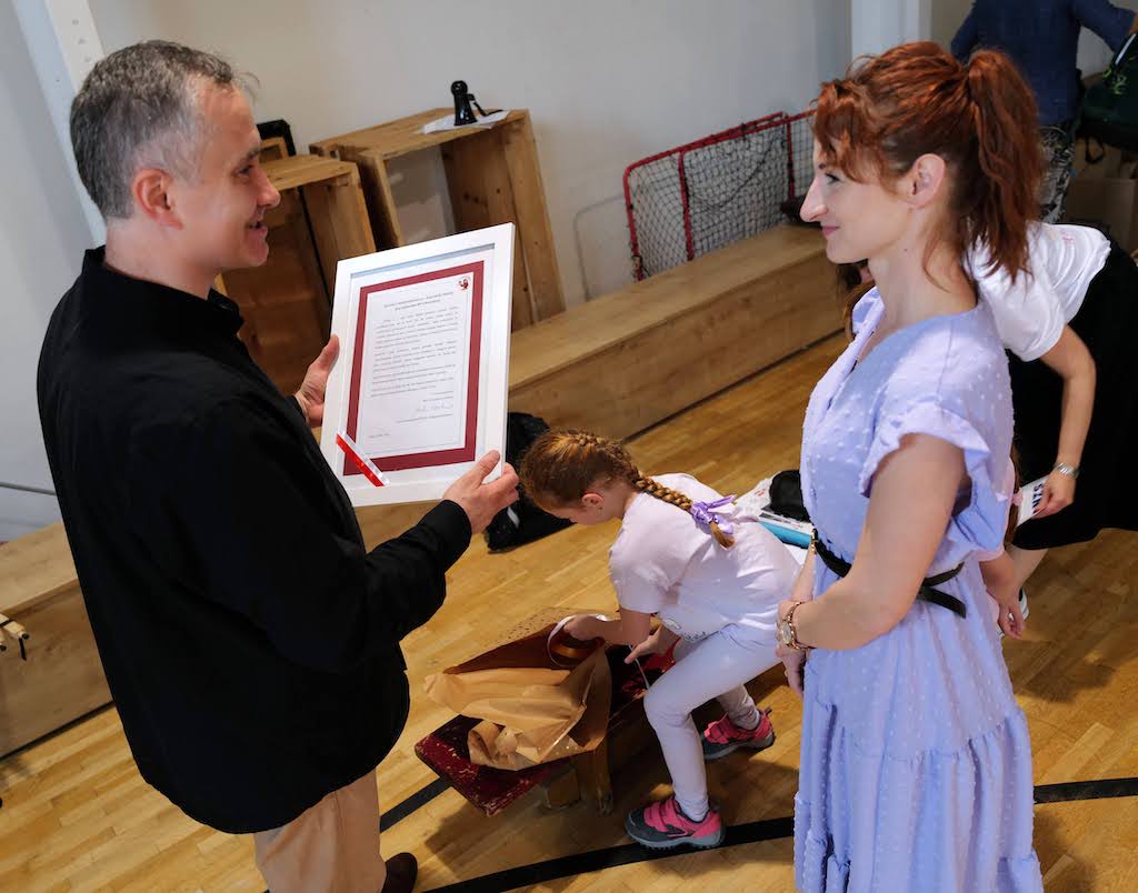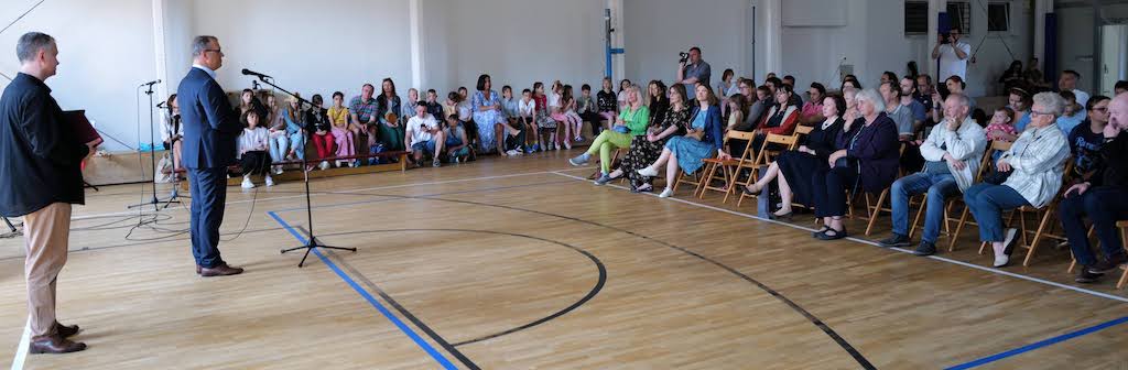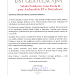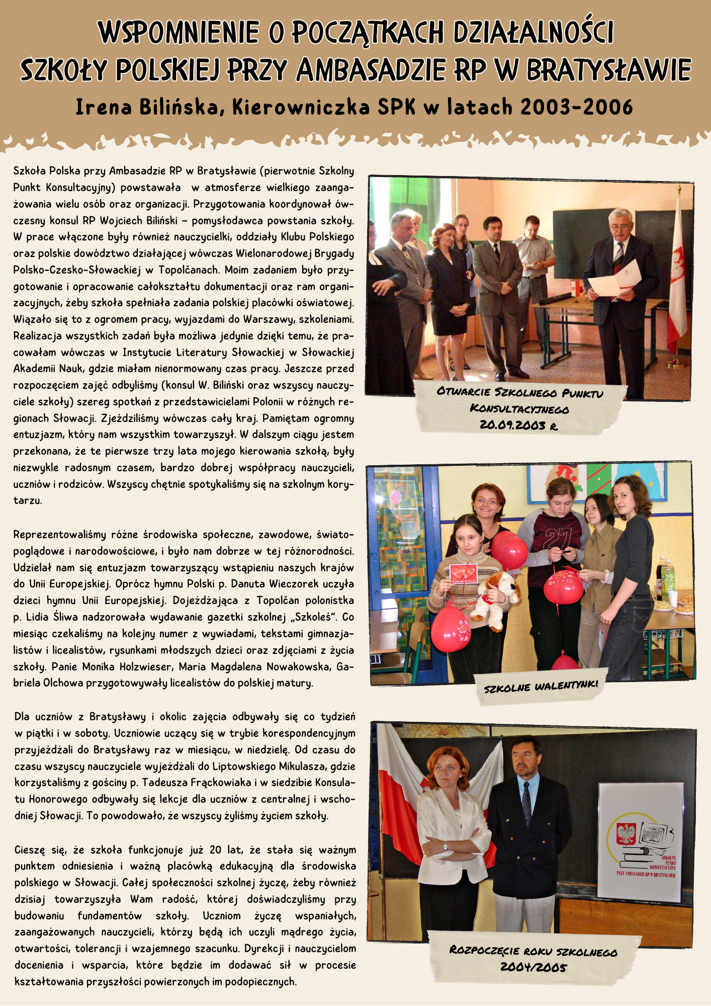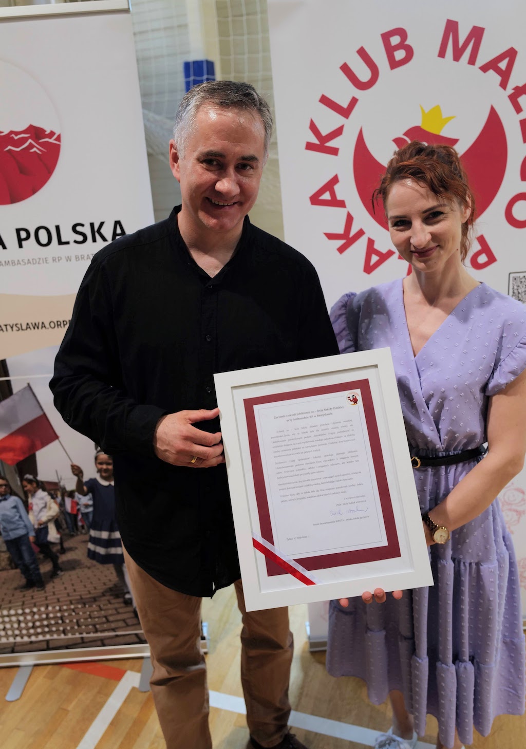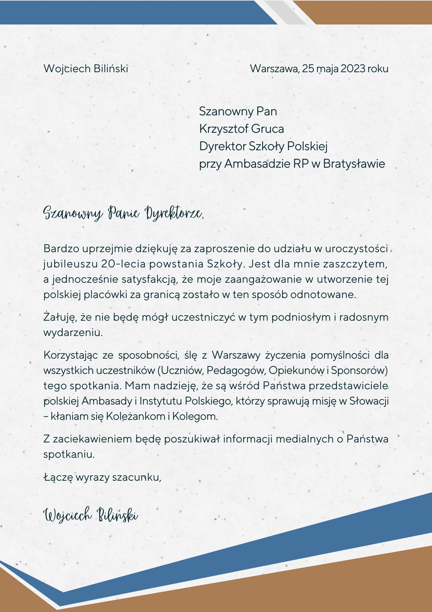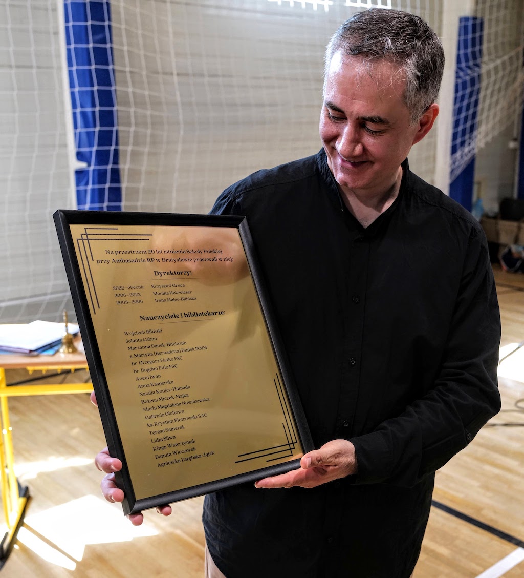 Program obchodów jubileuszu powstania Szkoły Polskiej był niezwykle bogaty. Rozpoczęło go przedstawienie przygotowane przez rodziców i uczniów, w którym jedni i drudzy… zamienili się miejscami – to rodzice stali się zapominalskimi uczniami, zaś ich dzieci troskliwymi rodzicami. Następnie pan dyrektor Krzysztof Gruca uroczyście przywitał przybyłych na jubileusz szkoły i przyjął życzenia nie tylko od gości, ale i od młodzieży szkolnej. Uczniowie przygotowali je razem ze swoją nauczycielką języka polskiego panią Marzanną Danek-Hnelozub. Natomiast Ambasador RP Krzysztof Strzałka odczytał list gratulacyjny od Dyrektora Departamentu Współpracy Międzynarodowej MSZ – pana Piotra Semeniuka. Listy gratulacyjne otrzymaliśmy również od pomysłodawcy i jednego z założycieli szkoły, pana Wojciecha Bilińskiego, Dyrektor ORPEG-u Justyny Kralisz oraz wspomnianej wcześniej Sylwii Subiak-Wtorekovej. Osobiście życzenia złożyła także dyrektor placówki w Wiedniu Hanna Kaczmarczyk oraz Rada Rodziców w składzie: Natalia Konicz-Hamada, Piotr Chrzanowski i Klaudia Bochen. Ci ostatni w imieniu całej społeczności szkolnej wręczyli dyrektorowi pamiątkową tablicę, uwieczniającą nazwiska dotychczasowych kierowników Szkoły Polskiej przy Ambasadzie RP w Bratysławie oraz pracujących w niej w latach 2003–2023 nauczycieli i bibliotekarzy.