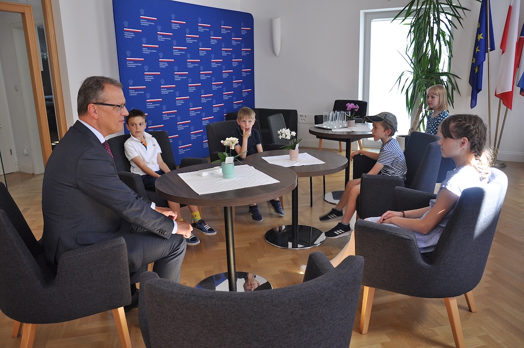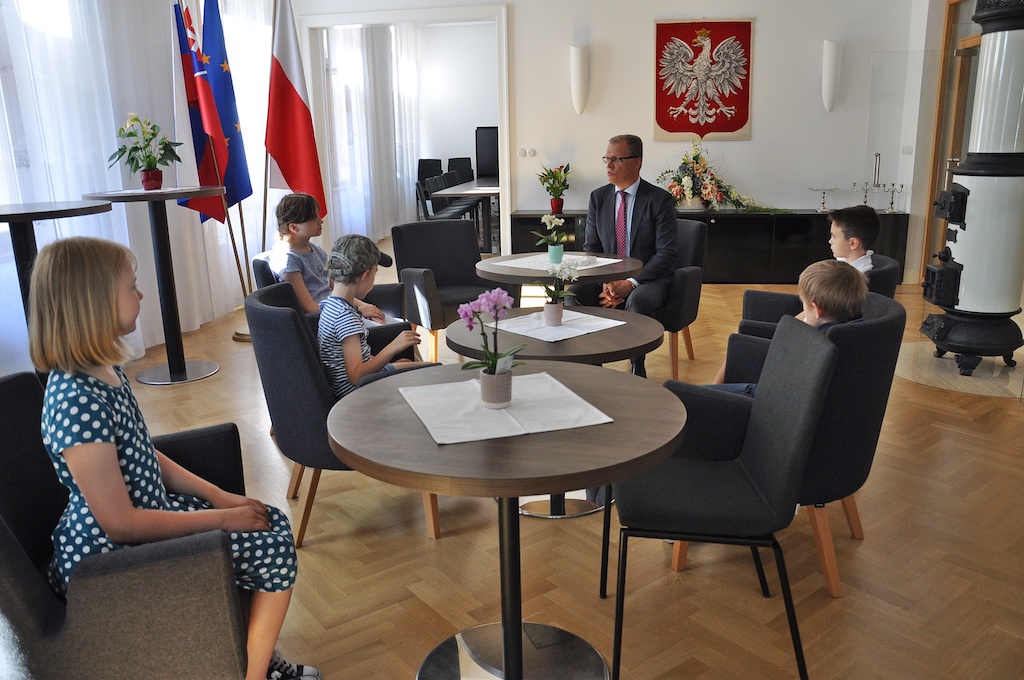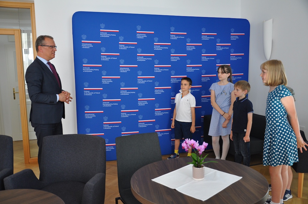 Najpierw pani konsul oprowadziła uczniów po wydziale konsularnym, opowiedziała im, jak się wyrabia paszporty oraz zdradziła kilka ciekawostek na temat telefonu dyżurnego, który jako polski przedstawiciel na Słowacji, musi nosić zawsze przy sobie na wypadek, gdyby jakiś polski obywatel pilnie potrzebował jej pomocy. Następnie do grupy dołączył pan ambasador. Podjął on dzieci w reprezentacyjnej sali kominkowej znajdującej się na pierwszym piętrze ambasady, gdzie przedstawił im, co lubi w swojej pracy najbardziej. Później cierpliwie odpowiadał na wszystkie pytania i z każdym wykonał sobie pamiątkowe zdjęcie.
